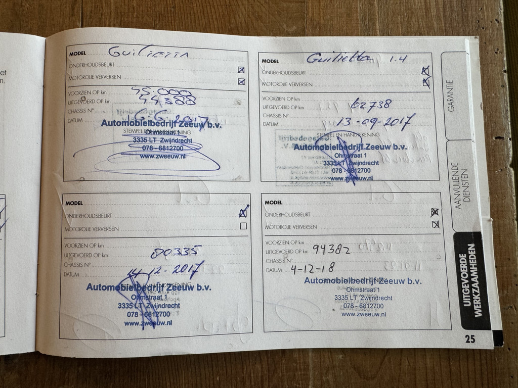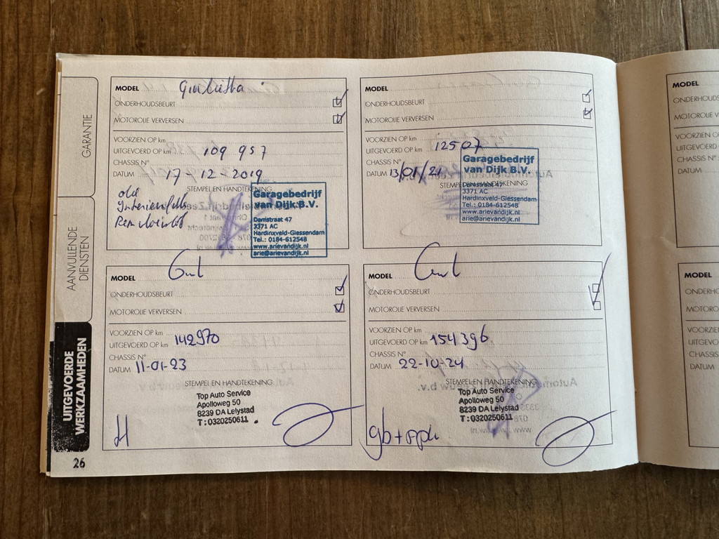 Naast de uitstraling is ook de staat en de historie natuurlijk om even bij stil te staan. Met een vol afgestempeld boekje en een hele mooie staat van dienst mag hij zich een prachtige auto noemen. De volgende opties en accessoires zijn ook nog aanwezig op deze Giulietta: