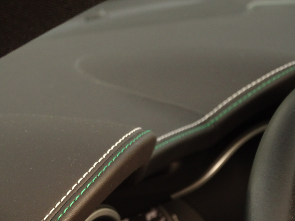 - witgrijze/groene stiksels op lederen dashboard en bekleding