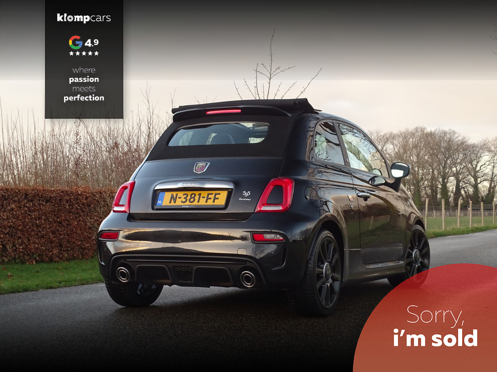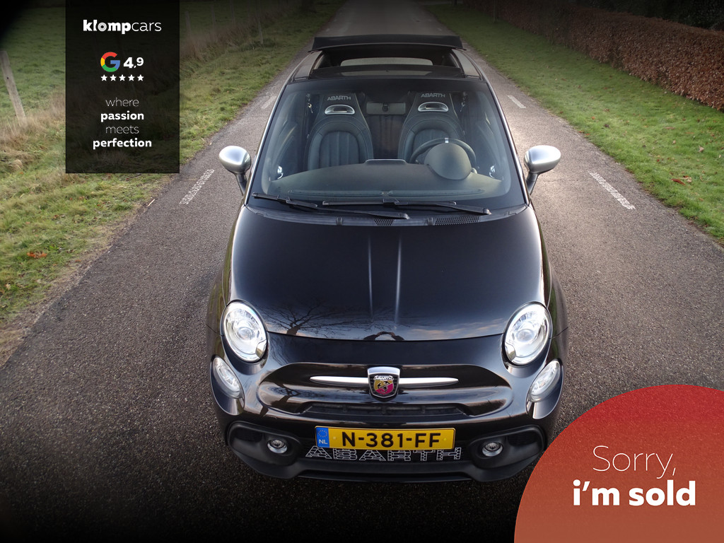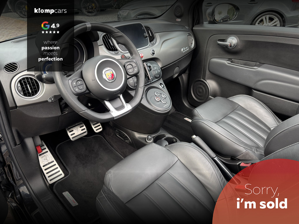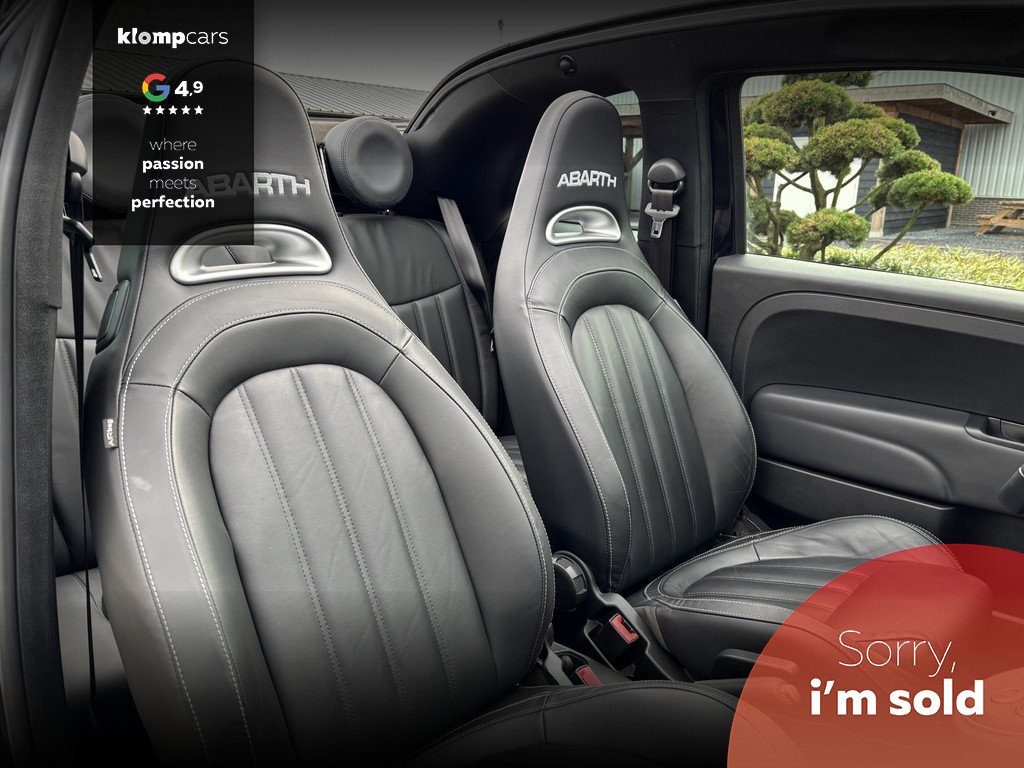 Een picture perfect deze Abarth 595 Cabrio Turismo in een zeer compleet jasje: Nero scorpione met Zwart leder! Heerlijk deze mooie zwarte metallic lak met de uiterst fraaie sportstoelen waar weer heel verfijnt de tekst "Abarth"ingestikt is maakt het weer een echte italiaan. Zelden zien we ze zo vol want bij deze 595 Turismo is de hele optielijst erop besteld en dat maakt het feest eigenlijk wel compleet. De 595 Turismo is standaard al heel compleet. We zullen de extra opties met u doornemen:Het open cabrio dak om van de zonnestralen en het geweldige geluid van wat de Abarth maakt te genieten, Xenon koplampen, led verlichting, grote 7 inch navigatie scherm, Geweldige Beats audio, Dimmende binnenspiegel, Climate control, prachtige optionele 17 inch velgen de mooiste velg onder de Abarth als u het ons vraagt. Wij hebben ze een volledige make over gegeven in Miron zwart Uiteraard moeten we u ook vertellen wat er onder de motorkap te vinden is: een 165 pk sterke 1.4 T-jet het betreft hier degene met de grote turbo gelijk aan een competizione 180 pk dit vermogen is daarom ook door H&S Corse met een tuning veilig naar 200pk gebracht.