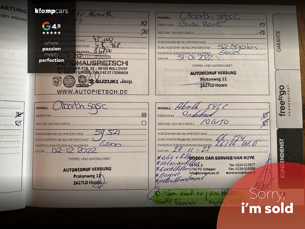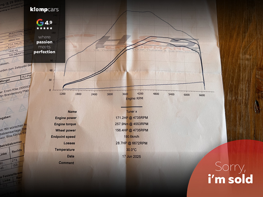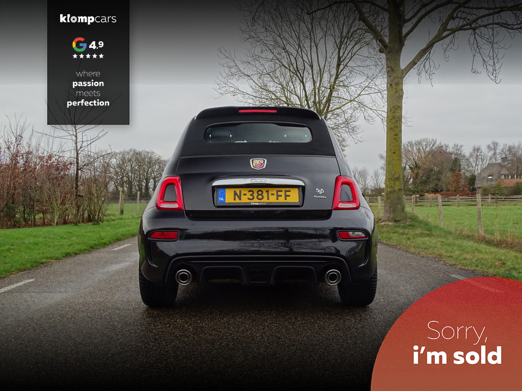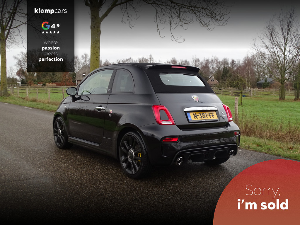 Een picture perfect deze Abarth 595 Cabrio Turismo in een zeer compleet jasje: Nero scorpione met Zwart leder! Heerlijk deze mooie zwarte metallic lak met de uiterst fraaie sportstoelen waar weer heel verfijnt de tekst "Abarth"ingestikt is maakt het weer een echte italiaan. Zelden zien we ze zo vol want bij deze 595 Turismo is de hele optielijst erop besteld en dat maakt het feest eigenlijk wel compleet. De 595 Turismo is standaard al heel compleet. We zullen de extra opties met u doornemen:Het open cabrio dak om van de zonnestralen en het geweldige geluid van wat de Abarth maakt te genieten, Xenon koplampen, led verlichting, grote 7 inch navigatie scherm, Geweldige Beats audio, Dimmende binnenspiegel, Climate control, prachtige optionele 17 inch velgen de mooiste velg onder de Abarth als u het ons vraagt. Wij hebben ze een volledige make over gegeven in Miron zwart Uiteraard moeten we u ook vertellen wat er onder de motorkap te vinden is: een 165 pk sterke 1.4 T-jet het betreft hier degene met de grote turbo gelijk aan een competizione 180 pk dit vermogen is daarom ook door H&S Corse met een tuning veilig naar 200pk gebracht.